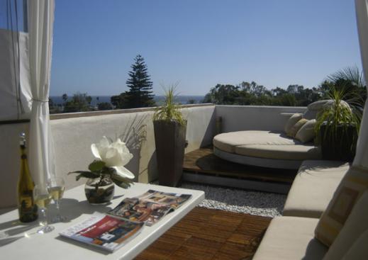 sum up the look and feel of this remodeled deck tile balcony.