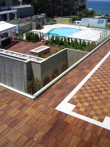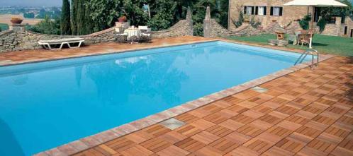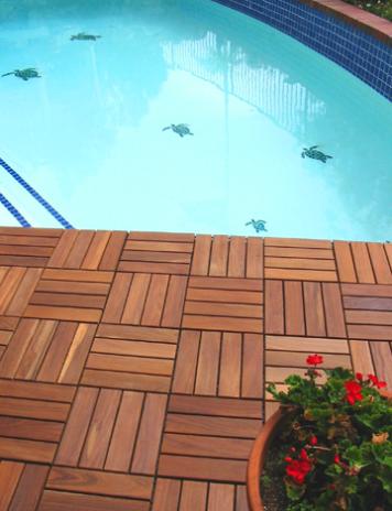 Brick bordered pool coping with deck tiles. Deck tiles around pool areas work